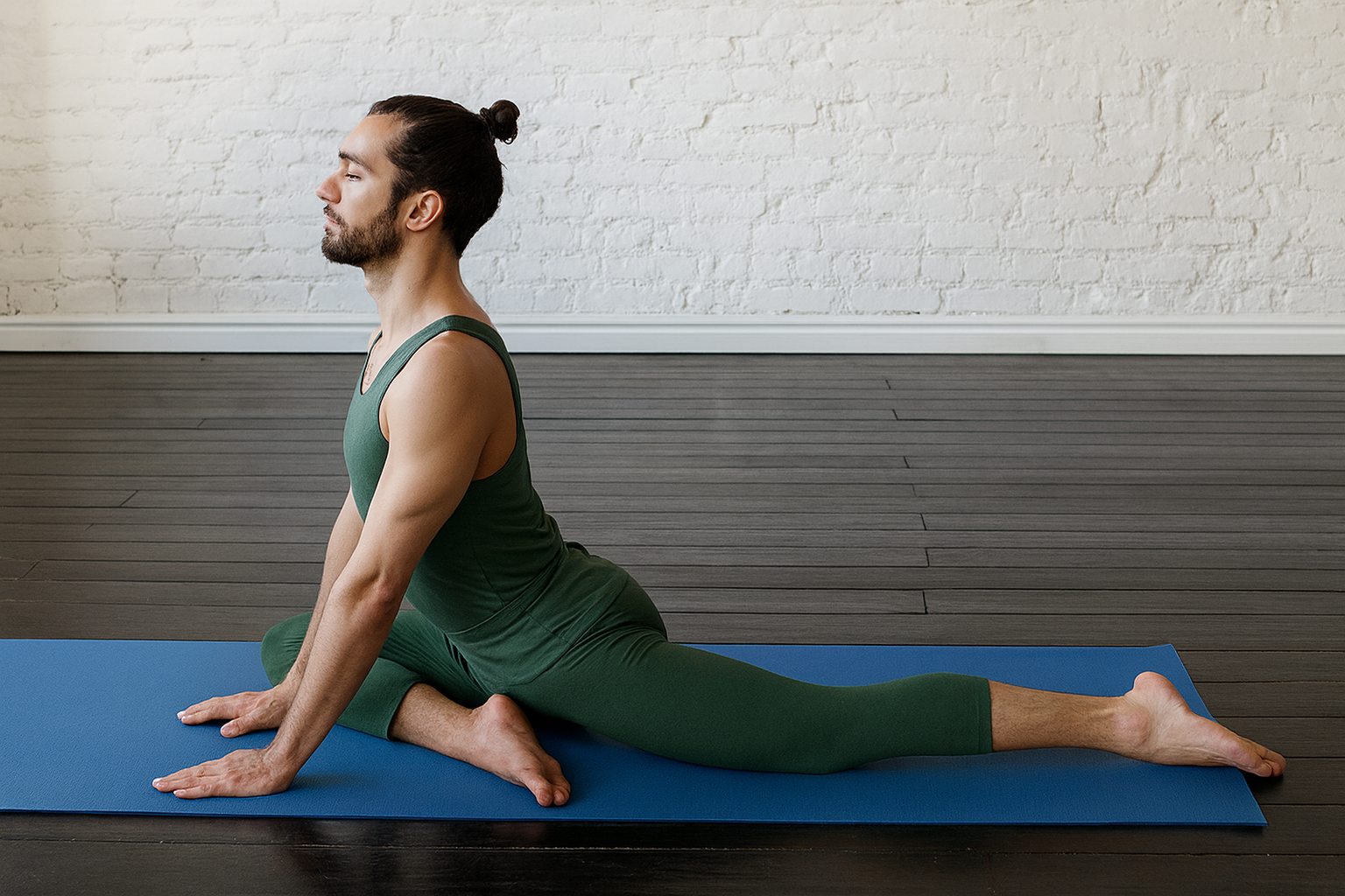 A deep hip-opening posture that releases tension, improves flexibility, and invites stillness and surrender.